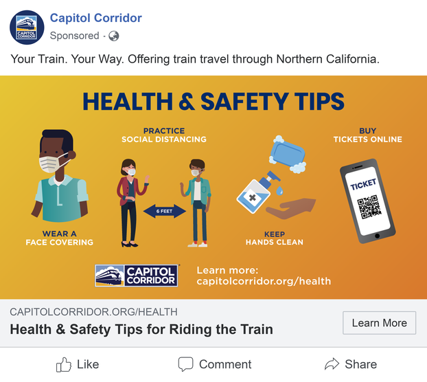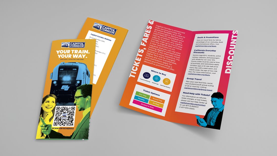 During the height of the COVID-19 pandemic in 2020, as ridership went down, we took the opportunity to develop a positive, colorful brand awareness campaign and applied it to Capitol Corridor's evergreen brochure and out-of-home media. We also continued with messaging using the cartoon characters to let riders know about enhanced health and safety protocols.
