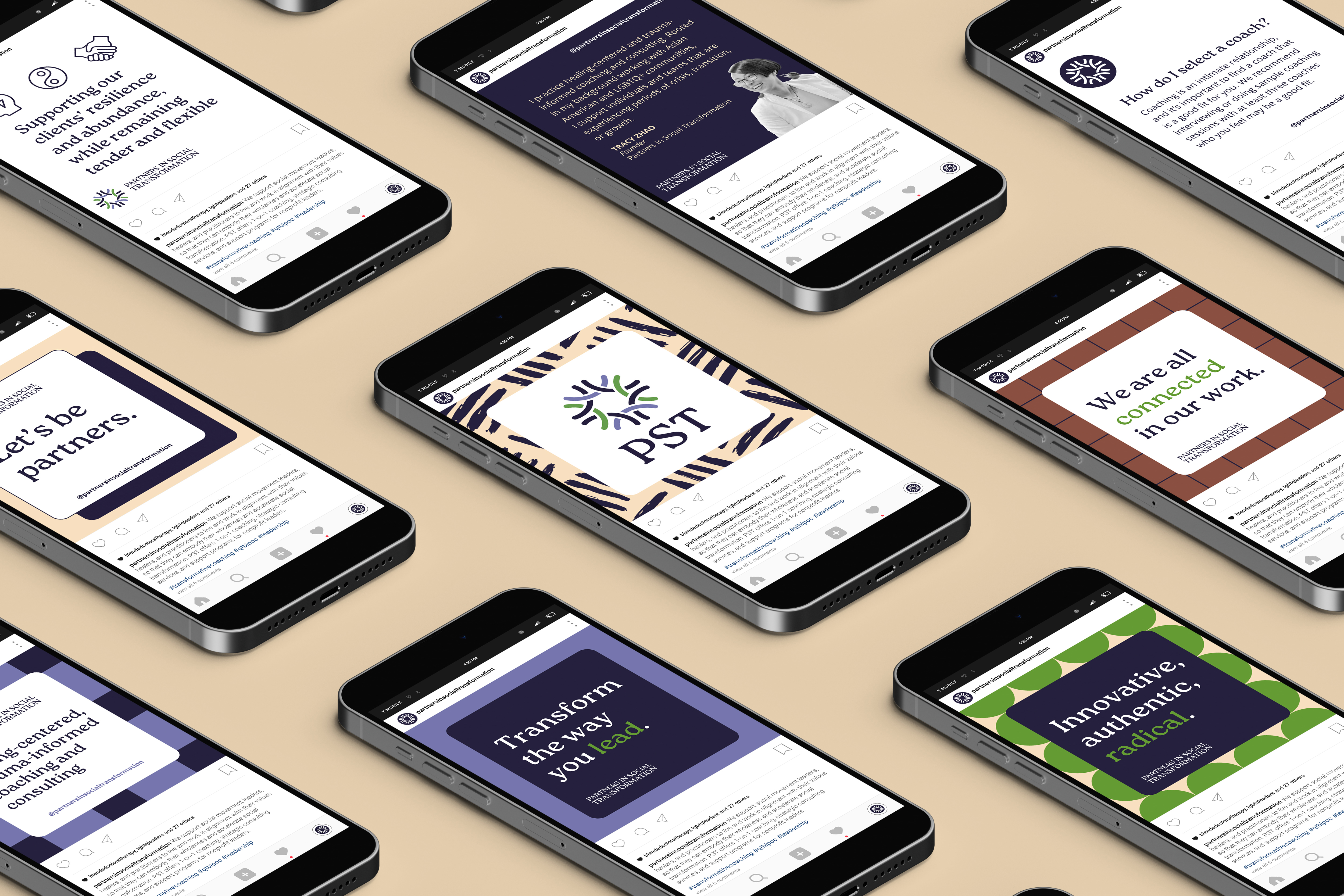 PST's logotype is inviting and friendly, which reflects its non-judgmental and supportive approach to their consulting practice. A soothing color palette indicates a brand that is caring and patient. Clean iconography and simple repeat patterns represent safety and equality, while hand-drawn elements denote PST's flexibility and playfulness amongst it all.