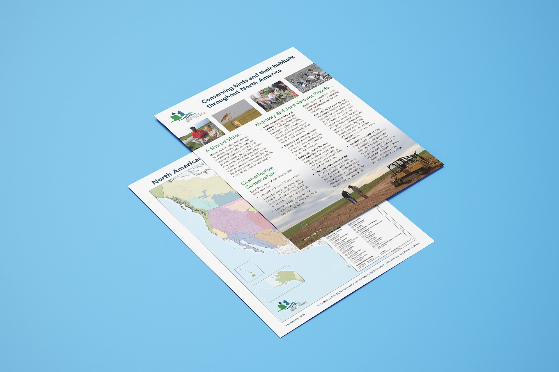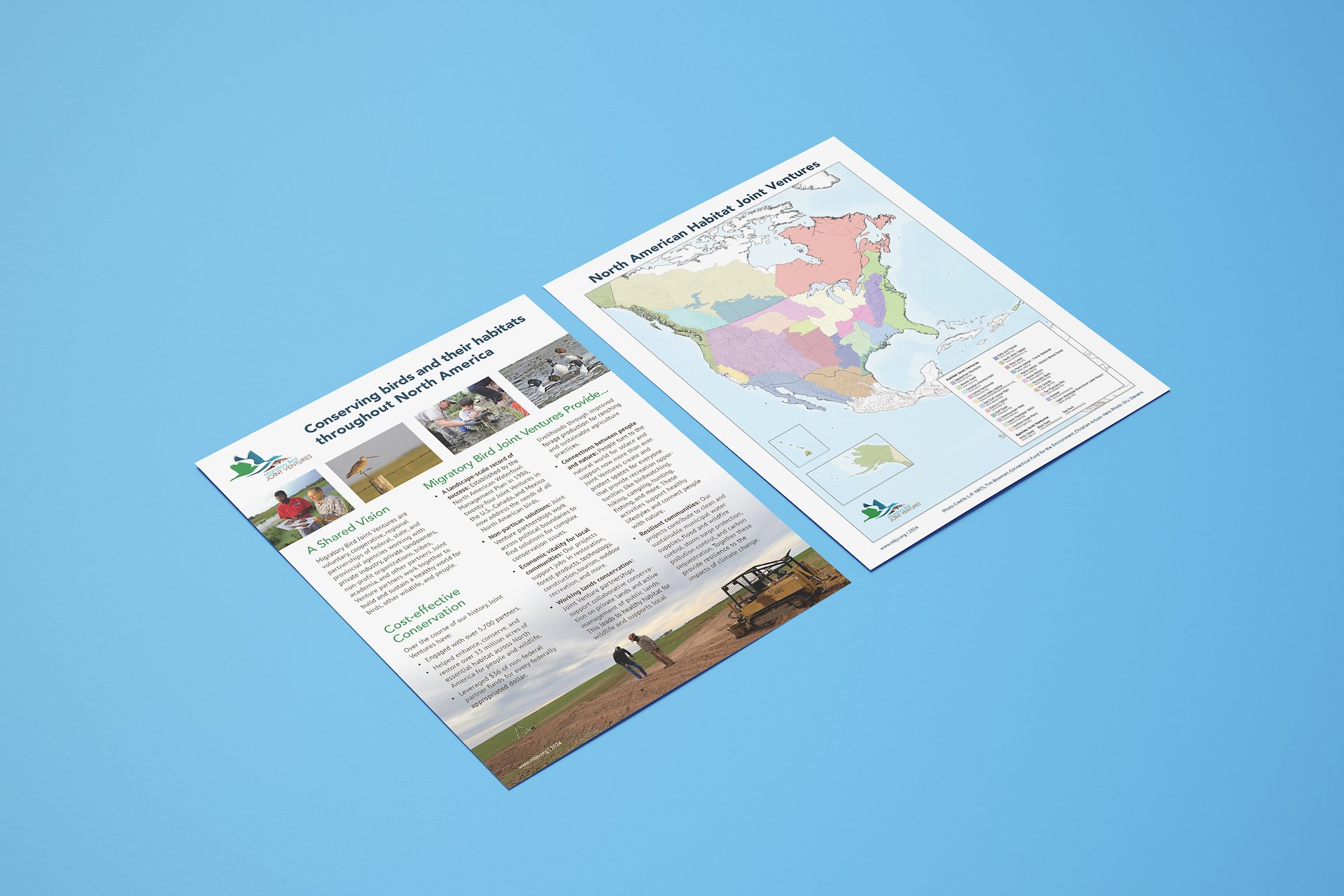 The U.S. Fish & Wildlife Service needed redesigns for their annual fact sheets for their Migratory Bird Joint Ventures and San Francisco Bay Joint Venture programs. These materials were to be presented to members of congress, their staffers, state legislators, and the Environmental Protection Agency in Washington, D.C. for the Joint Venture Fly-In convention in March.